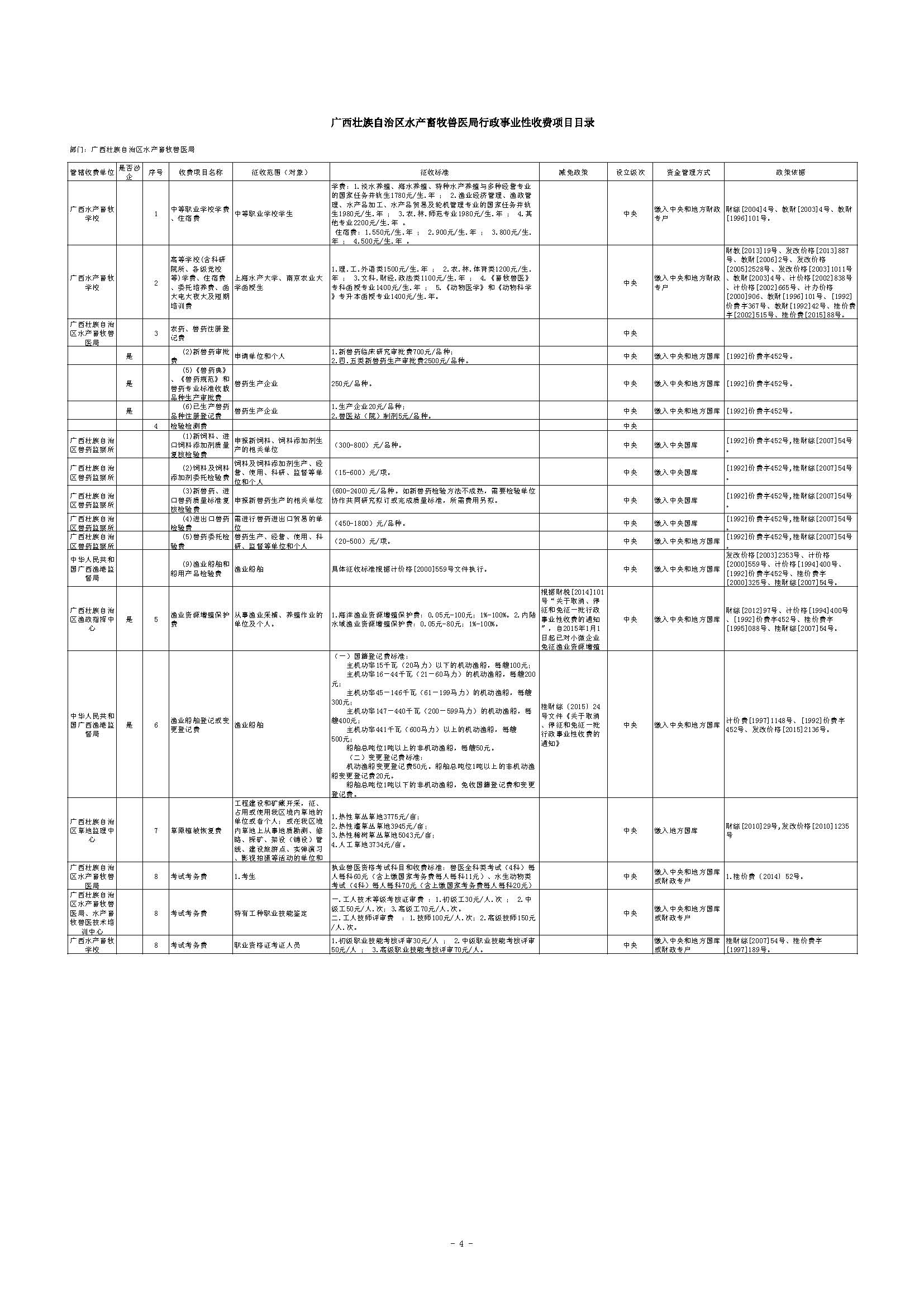 >> 广西壮族自治区水产畜牧兽医局行政事业性收费项目目录