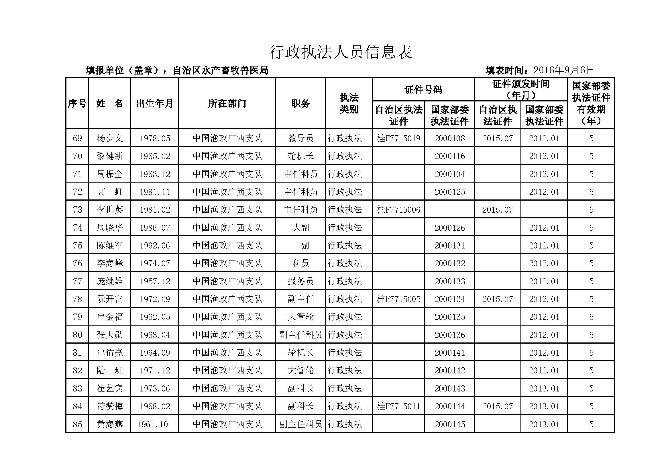 >> 自治区水产畜牧兽医局行政执法人员信息表(2016.11.7)