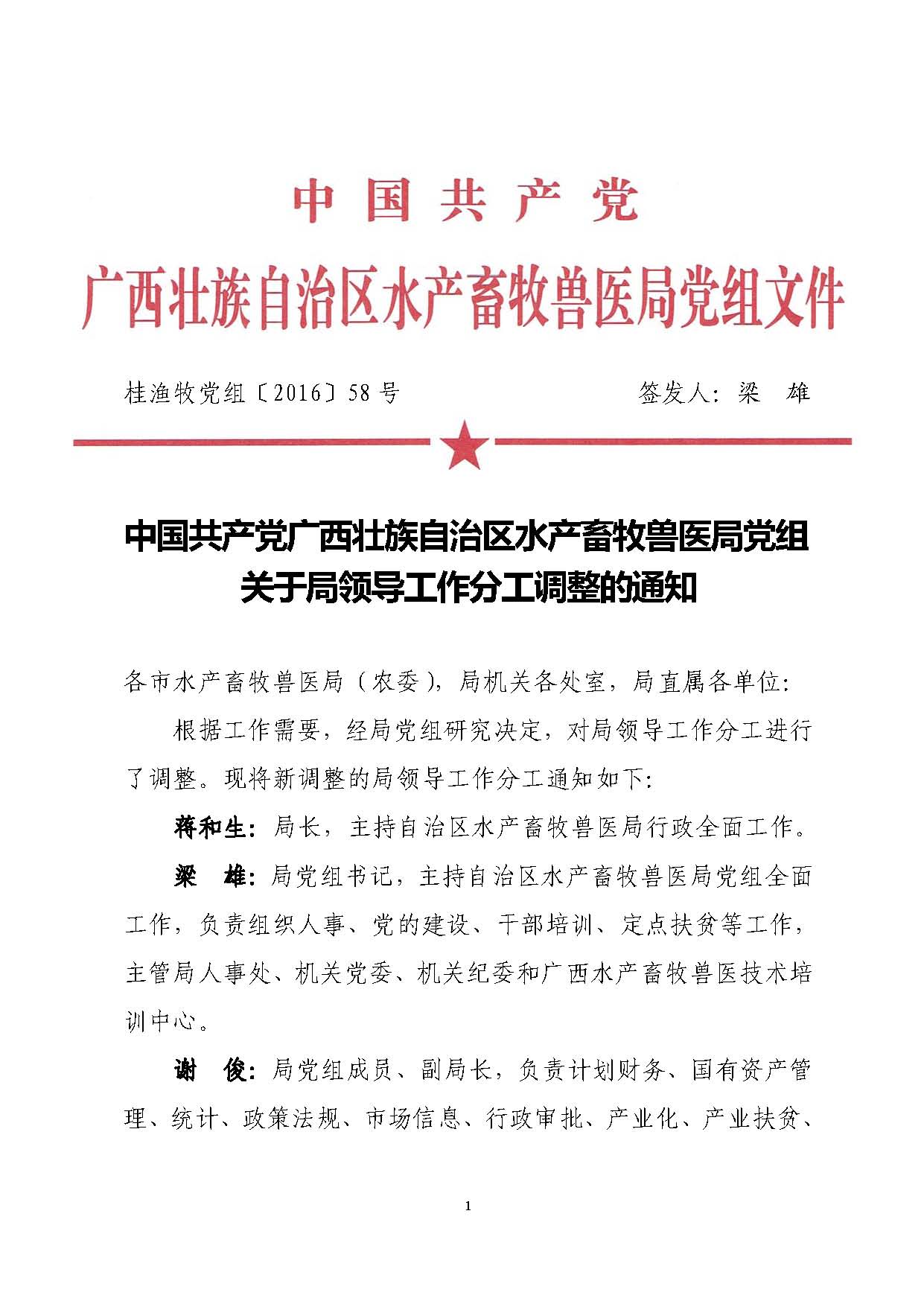 >> 中国共产党广西壮族自治区水产畜牧兽医局党组关于局领导工作分工调整的通知