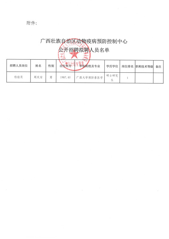 >> 广西动物疫病预防控制中心2016年度公开招聘拟聘人员公示