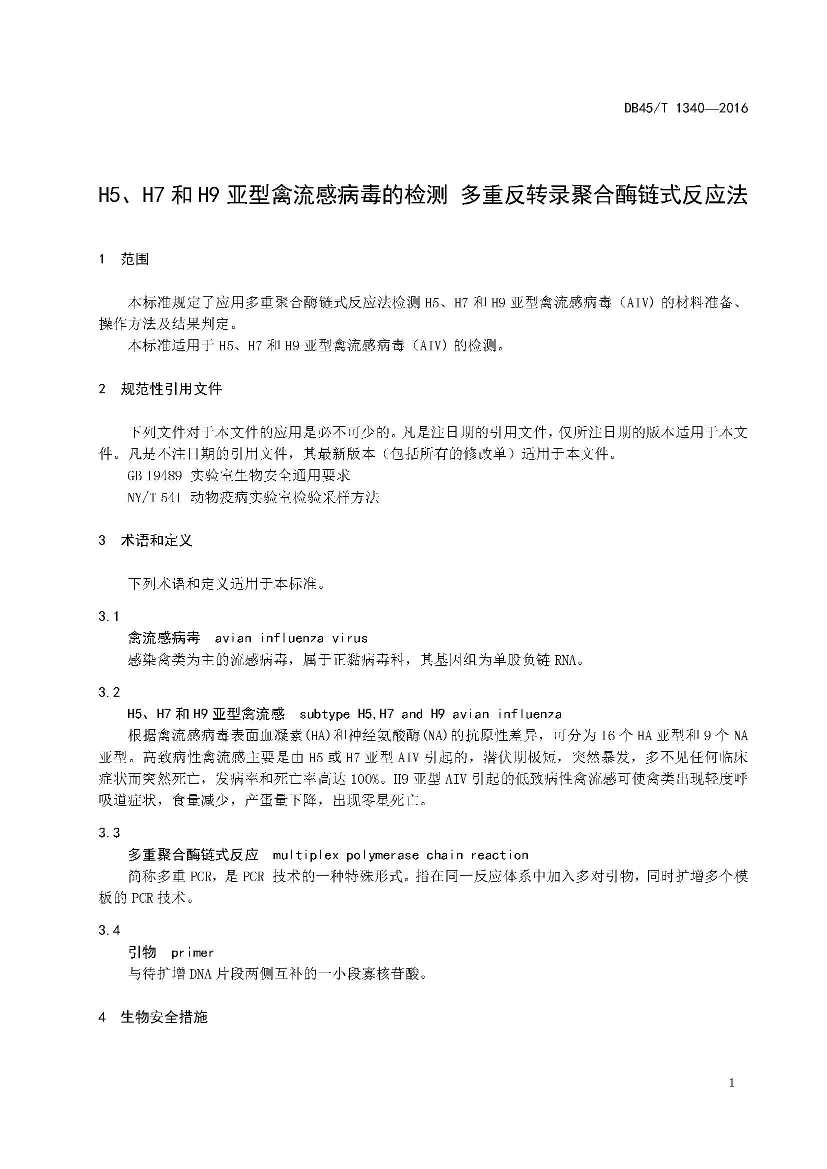 下载:260H5、H7 和 H9 亚型禽流感病毒的检测 多重反转录聚合酶链式反应法(DB45T 1340-2016).pdf
