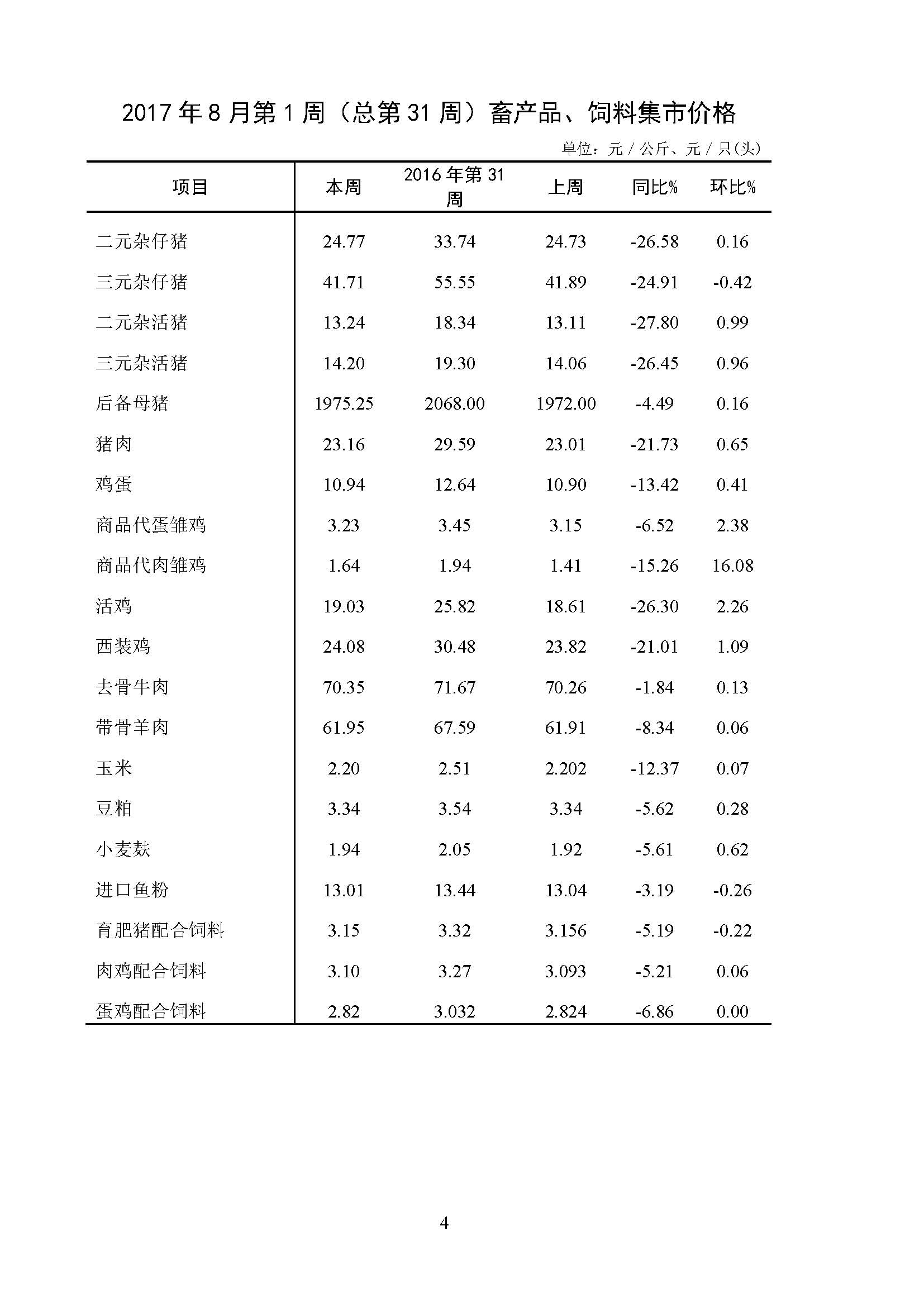 2017年8月第1周(总第31周)畜产品、饲料集市价格